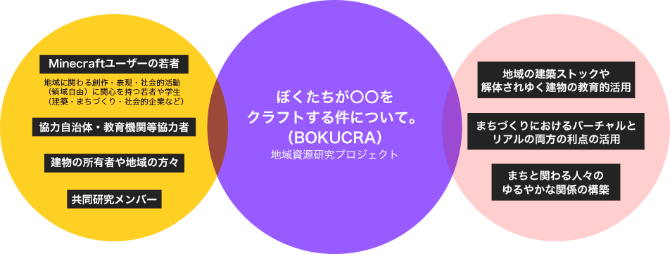 『ぼくたちが○○をクラフトする件について。(BOKUCRA)』は、オンラインものづくりゲームのMinecraft(マインクラフト)に関心のある子どもや若者とともに、地域と連携した制作拠点を開発し、バーチャルとリアルをかけ合わせた新しいまちづくりを行っています。